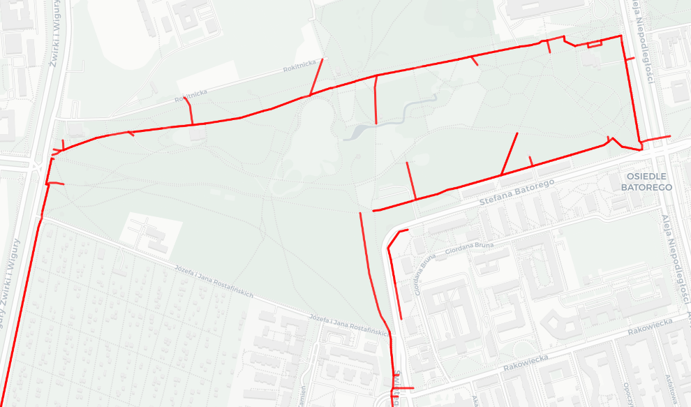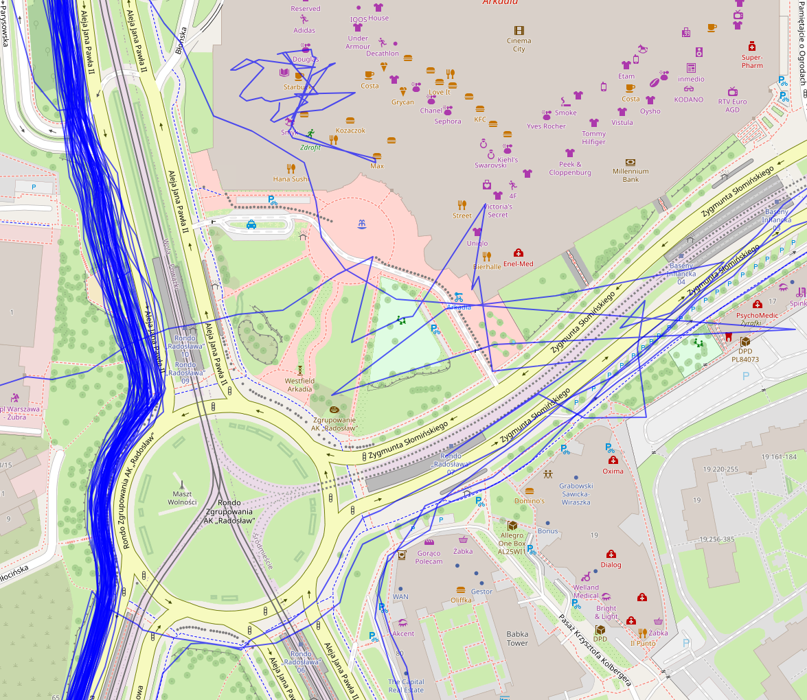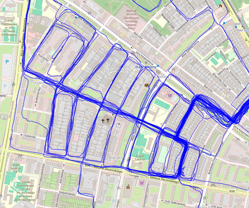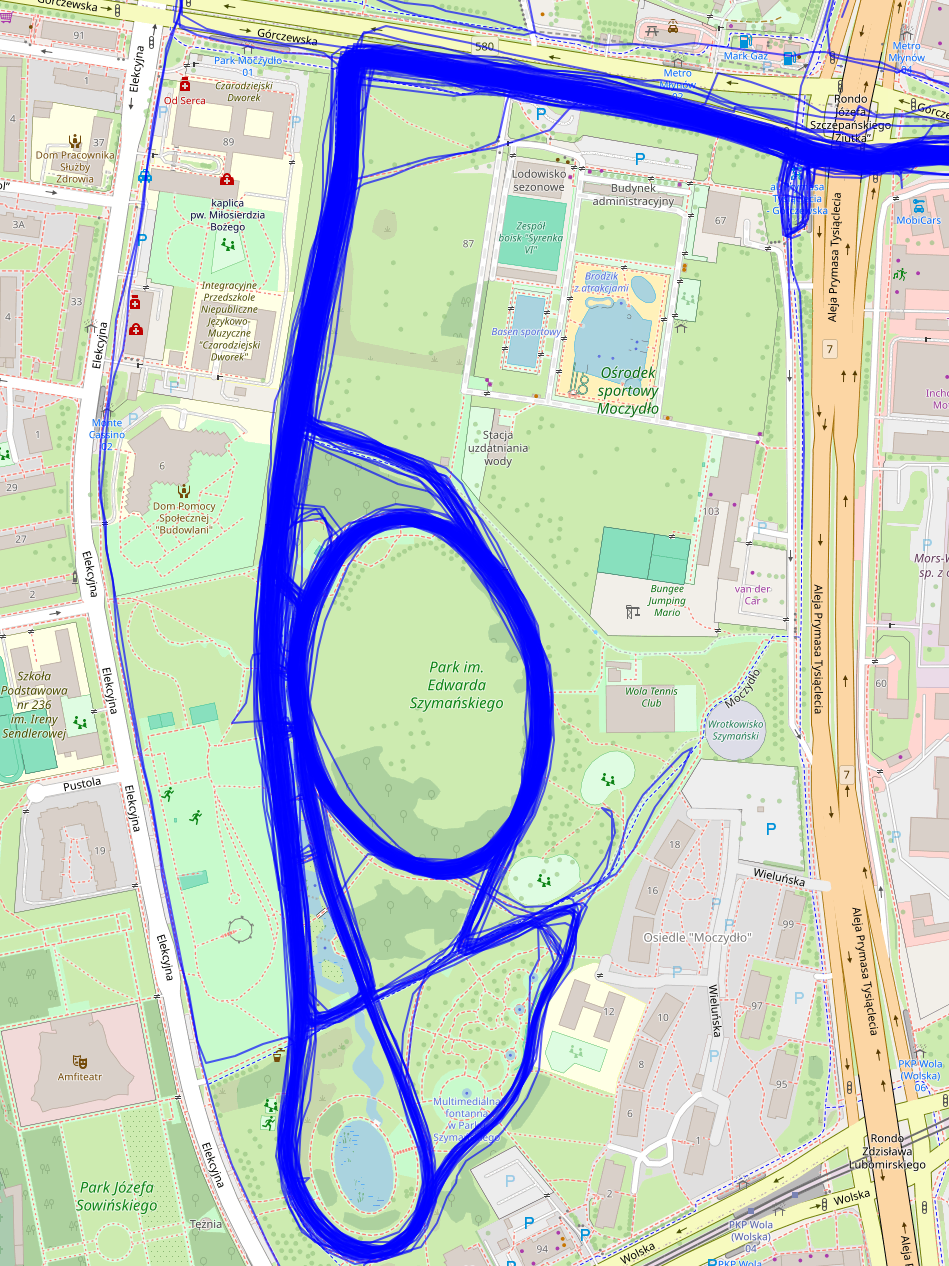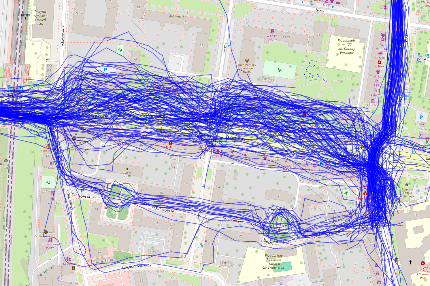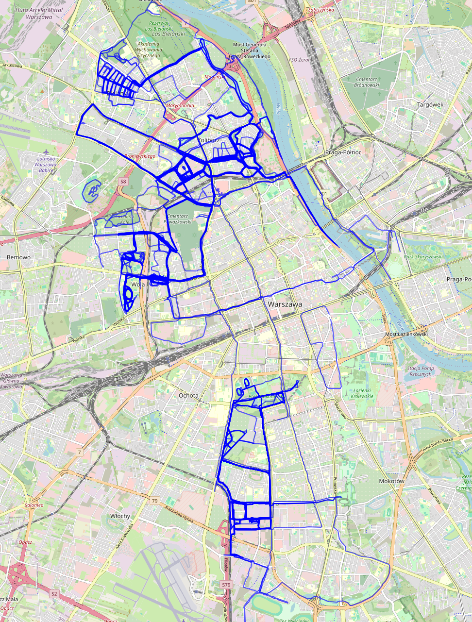 Once we load the data, we need to filter only activities that took place in Warsaw. Then, to check what we are dealing with here we can take the raw GPS points and connect them to form a line (well, actually a polyline) - one line per activity. In Figure 2 you can see such visualization.