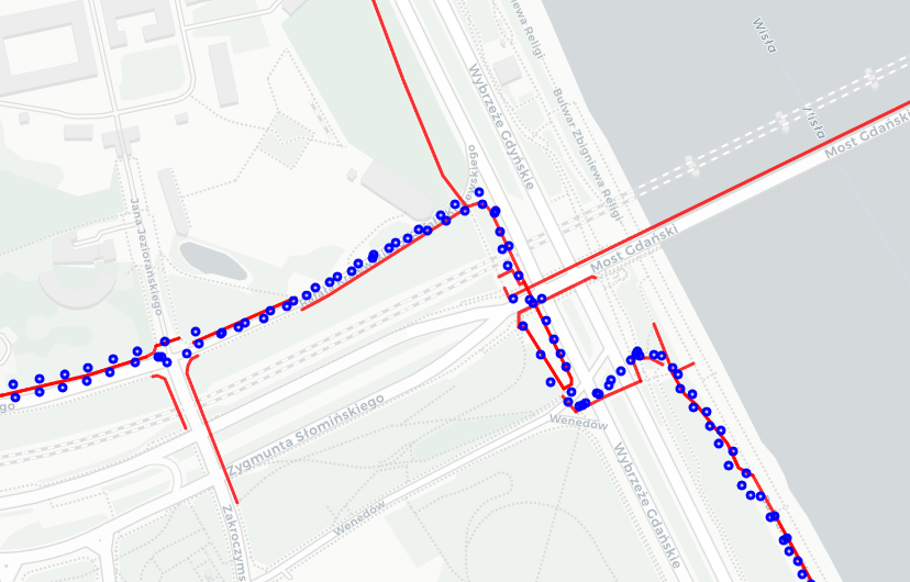 Figure 9 and Figure 10 show these issues precisely: weird wandering around different places and discontinuity between road segments. To emphasize how inaccurate such mapping can be, Figure 10 shows additionally raw GPS points (as blue points).