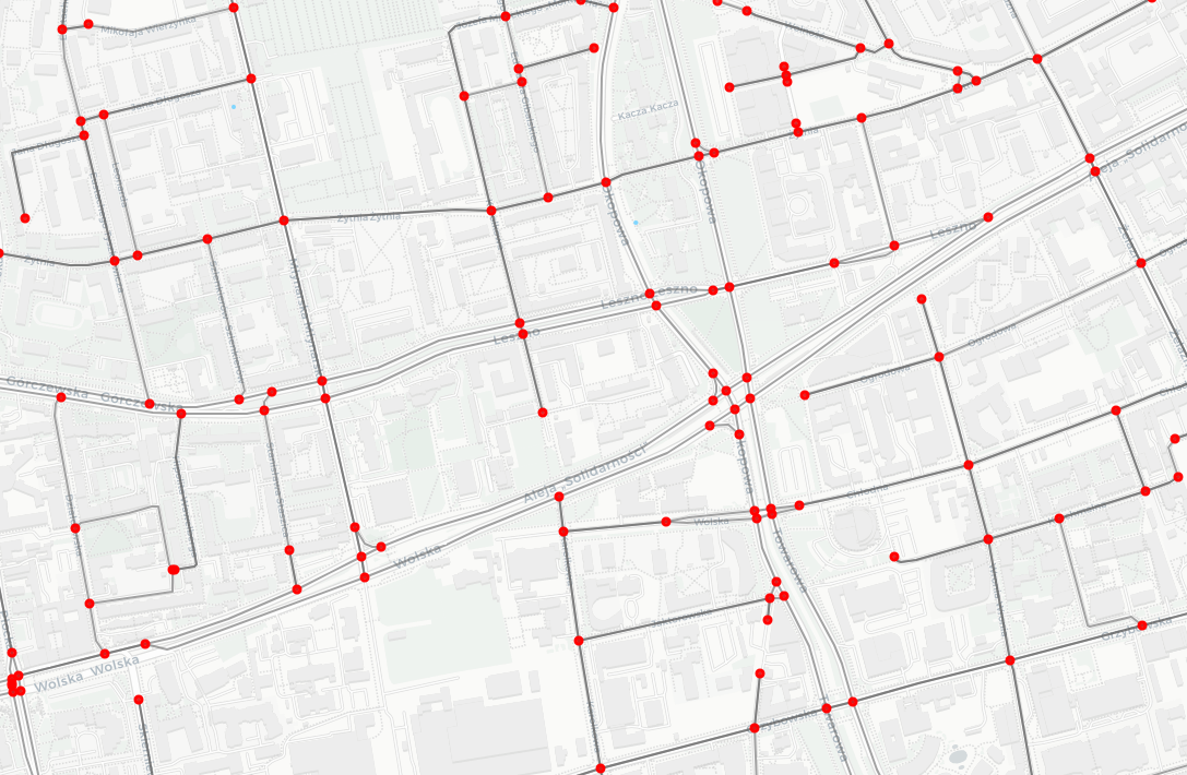 The important thing to start with is to know that road networks are represented as graphs. A graph is a collection of edges and nodes, and is a natural way to model/represent the fact that some objects are related. For example a graph might represent a group of people with certain relationships (family connections, friendships, etc.). For such an example people are represented as nodes, and those relationships are edges. For road networks, road segments are edges and intersections are nodes. In Figure 8 you can find a real-world example of a road network - nodes are red points, and edges are black lines (polylines). For simplicity only drivable public streets for motor vehicles are included.