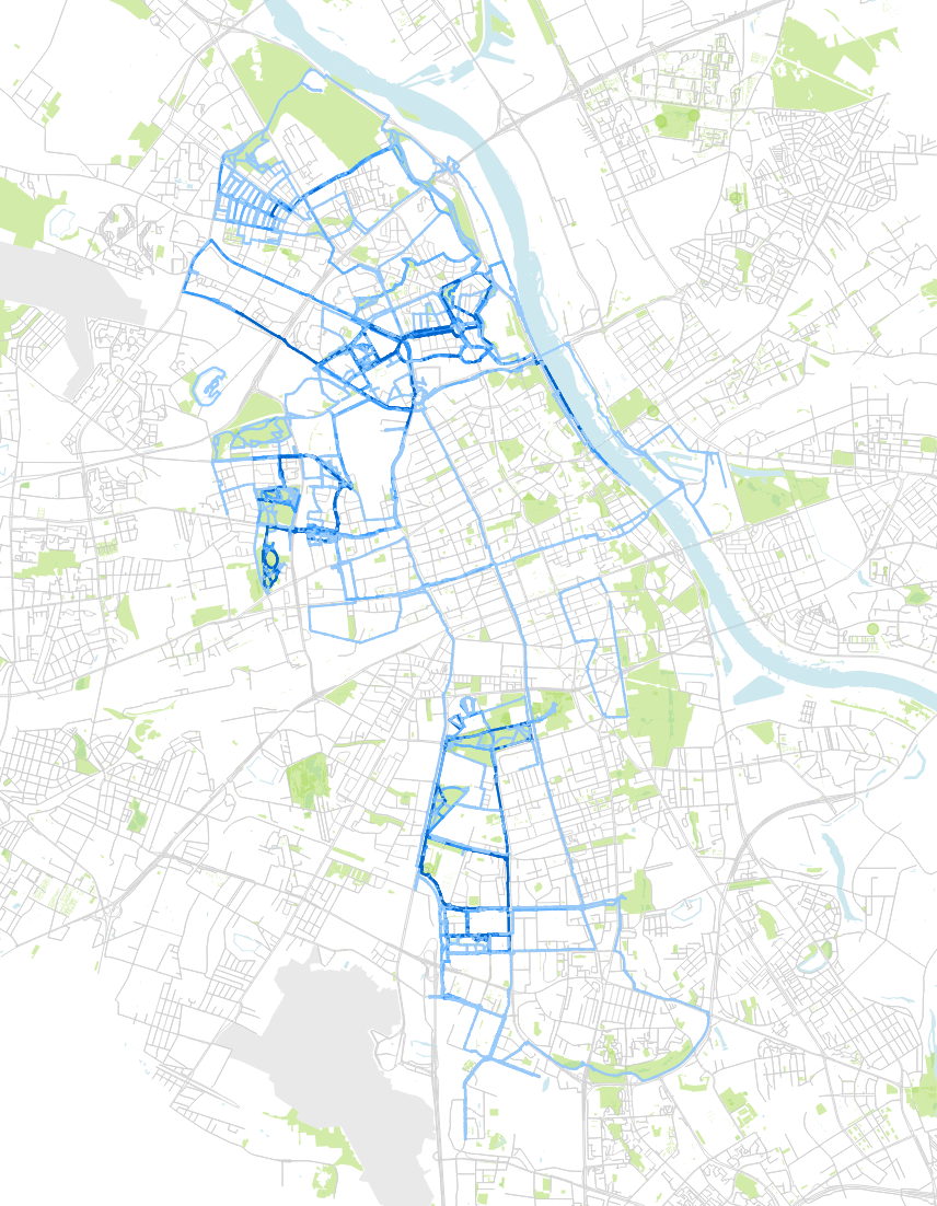 I wanted it to be more vivid, that is why I added colors for parks, forests, the river and other water areas. The original road network color would make the used road segments hard to see, that is why I changed its color to grey. Plus I categorized road segments used for running into 5 buckets (depending on the usage) and picked up color opacity accordingly (the more used a road segment, the darker the color). All those changes translate to a map presented in Figure 13.